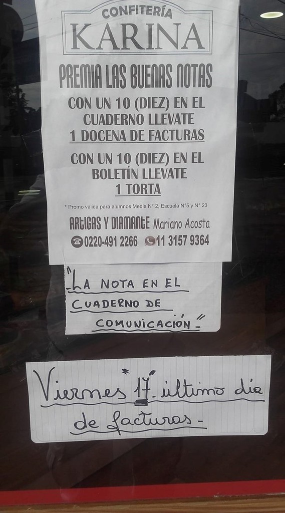 A algunos padres les resulta difícil lograr que sus hijos saquen excelentes notas. Es por esto que al dueño de una panadería, en Mariano Acosta, se le ocurrió premiar a los niños que saquen 10 en sus calificaciones con una docena de facturas.